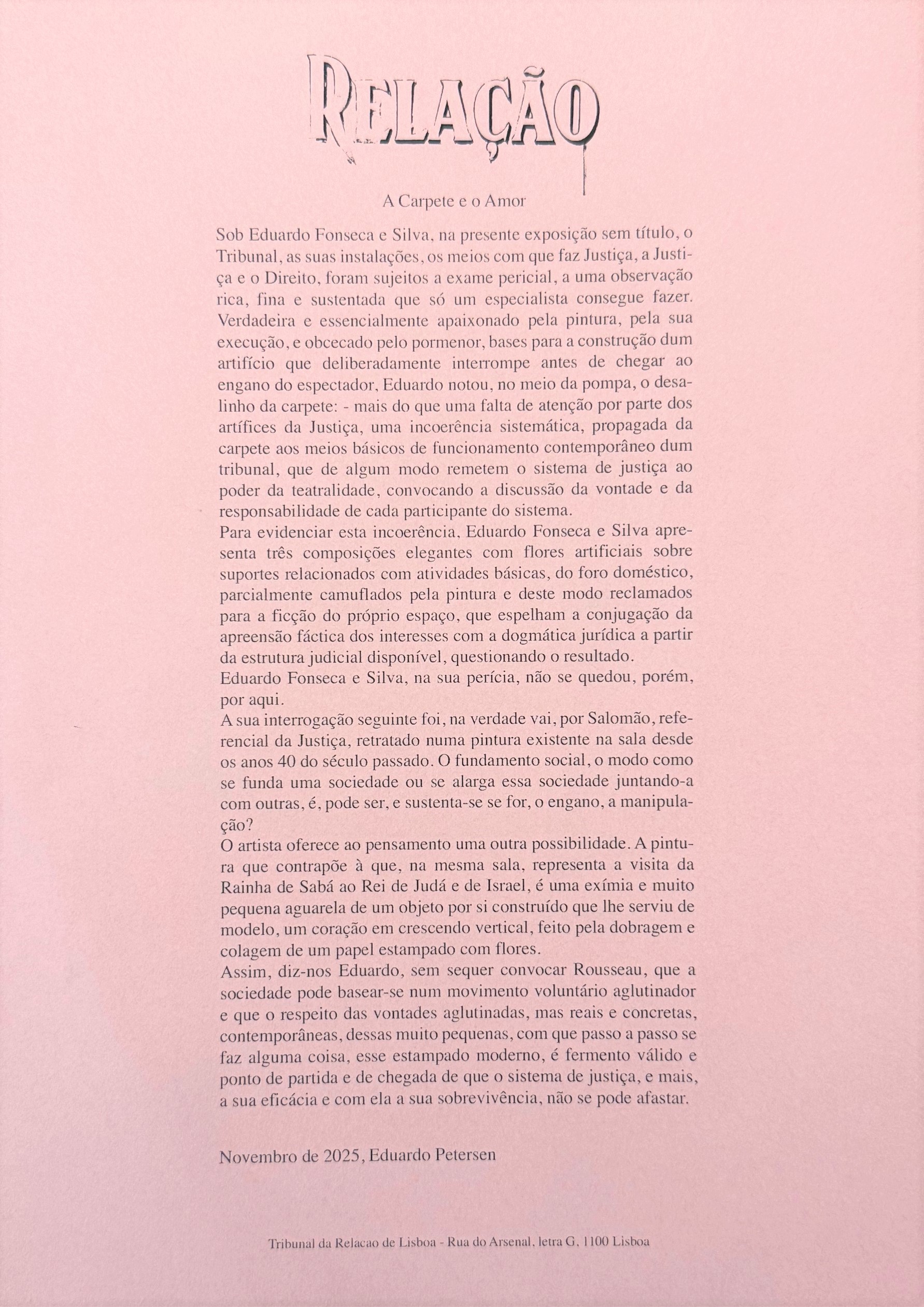 No dia 13 de novembro de 2025 teve lugar no Tribunal da Relação de Lisboa a inauguração da Exposição “Relação”, de Eduardo Fonseca e Silva, exposição inaugural do Ciclo “Arte e Património”.