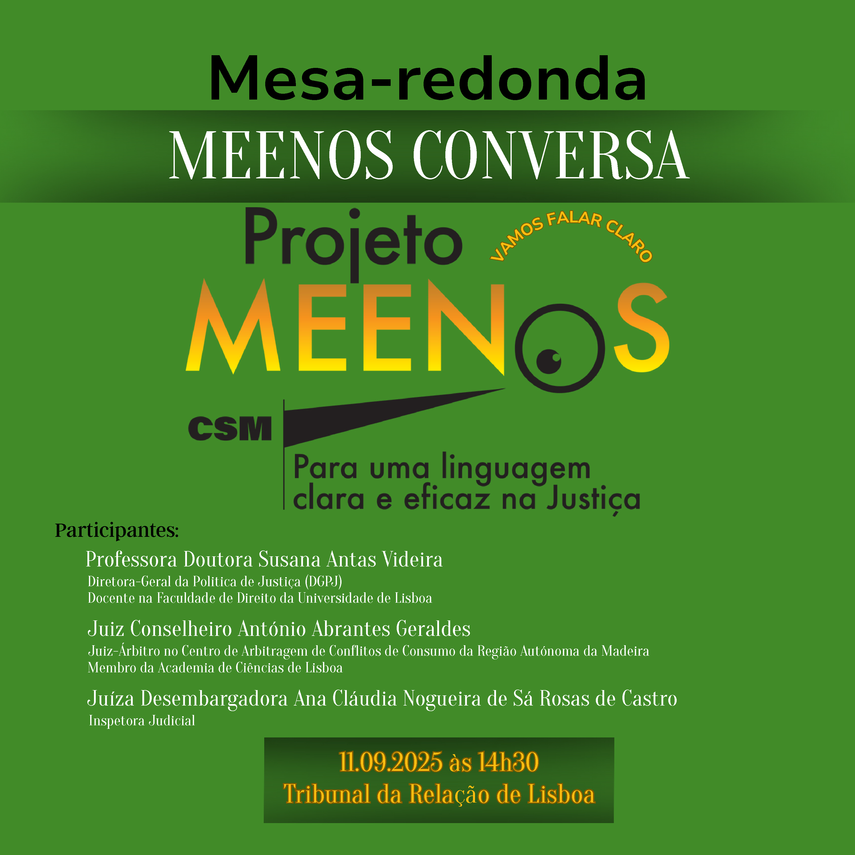 No dia 11 de setembro de 2025, o Tribunal da Relação de Lisboa acolheu Mesa Redonda relativa ao Projeto MEENOS CONVERSA – Para uma linguagem clara e eficaz na Justiça, organizada pelo Conselho Superior da Magistratura (CSM), em articulação com o Tribunal da Relação de Lisboa.